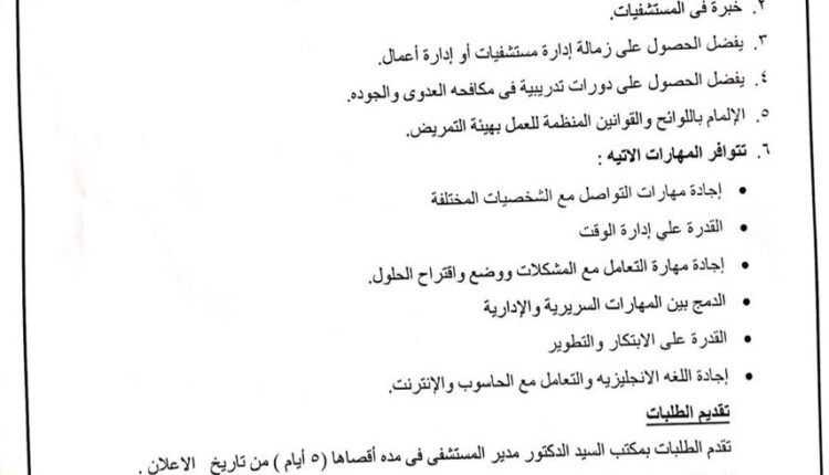 وأكدت مديرية الصحة بالقاهرة خلال الاعلان أنه لابد من توافر المهارات الاتيه إجادة مهارات التواصل مع الشخصيات المختلفة ، القدرة علي إدارة الوقت، إجادة مهارة التعامل مع المشكلات ووضع واقتراح الحلول ، الدمج بين المهارات السريرية والإدارية ، القدرة على الابتكار والتطوير، مع إجادة اللغه الانجليزيه والتعامل مع الحاسوب والإنترنت