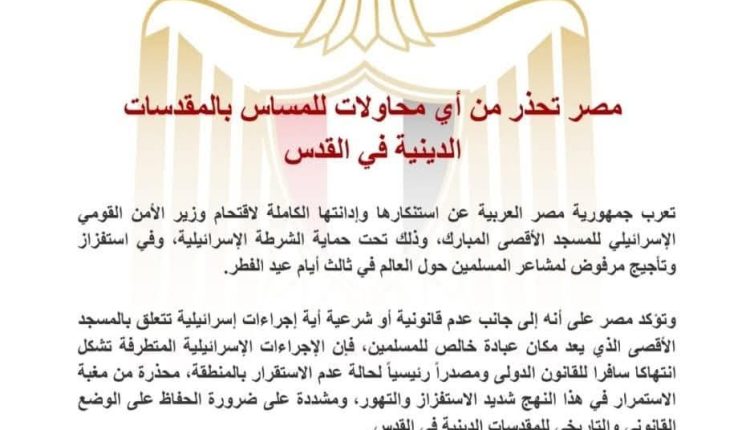 تعرب جمهورية مصر العربية عن استنكارها وإدانتها الكاملة لاقتحام وزير الأمن القومي الإسرائيلي للمسجد الأقصى المبارك، وذلك تحت حماية الشرطة الإسرائيلية، وفي استفزاز وتأجيج مرفوض لمشاعر المسلمين حول العالم في ثالث أيام عيد الفطر.