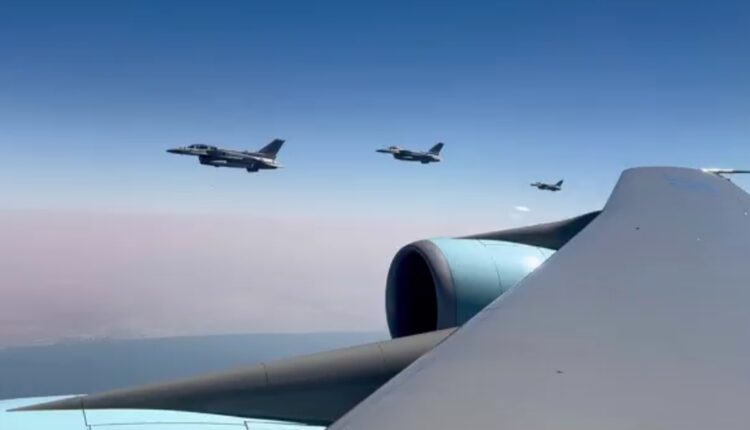 سرب من الطائرات الحربية الإماراتية ترحب بزيارة الرئيس الامريكي دونالد #ترامب اثناء دخوله الاجواء الإماراتية #الإمارات #امريكا.. فيديو