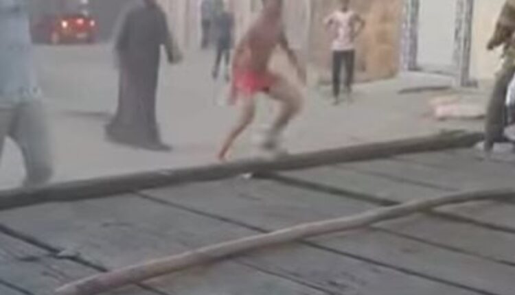 وأظهر الفيديو المتداول الشاب وهو يقف في شارع الوحدة الصحية بالقرية، عاري الجسد، ممسكًا بسلاح أبيض، ويعتدي على أحد المارة أثناء مروره بدراجته النارية، في مشهد أثار استياء وغضب الأهالي.
