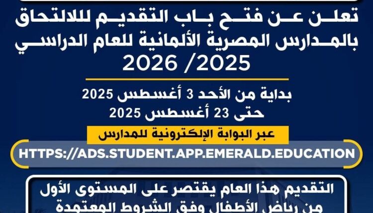 وفي هذا الإطار تُعلن الوزارة عن فتح باب التقديم للالتحاق بالصفوف الدراسية الجديدة في المدارس المصرية الألمانية، للعام الدراسي 2025/ 2026، وذلك عبر البوابة الإلكترونية للمدارس بداية من اليوم الأحد الموافق 3 أغسطس 2025 حتى يوم 23 أغسطس 2025: