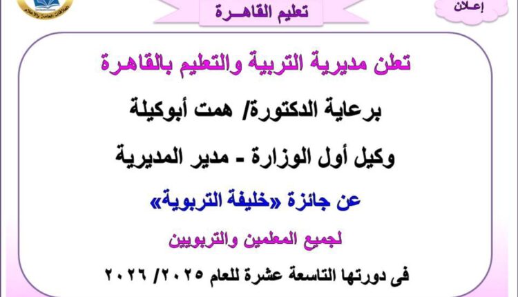 ..إيمانا بالدور المحوري للمعلمين والمربين في بناء مستقبل أجيالنا، وتأكيدًا على أهمية التقدير والاحتفاء بالتميز والإبداع في الميدان التربوي، يسرنا أن نوجه عنايتكم إلى جائزة خليفة التربوية في دورتها التاسعة عشرة (٢٠٢٥/ ٢٠٢٦)