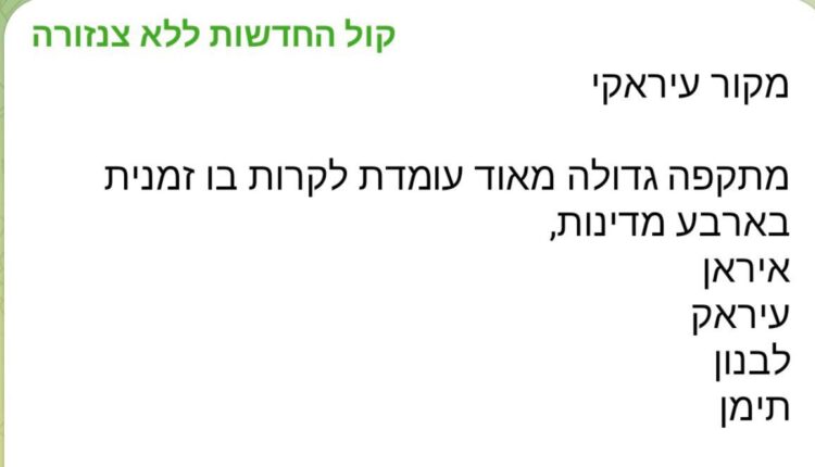 كشفت صحيفة “حدشوت” العبرية في تقرير عاجل مساء اليوم عن معلومات وُصفت بـ”الخطيرة للغاية”، تفيد بأن هجومًا كبيرًا ومنسقًا على وشك الحدوث في أربع دول هي: إيران، العراق، لبنان، واليمن، وذلك في توقيت واحد بهدف إرباك الوضع الإقليمي وفتح أكثر من جبهة في آنٍ واحد.