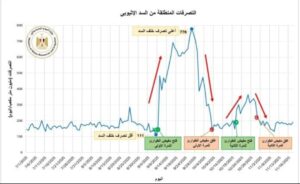4.وهو ما حدث بالفعل، حيث ارتفع منسوب المياه داخل بحيرة السد الإثيوبي مرة أخرى ليقترب من منسوب 640متراً، وفي يوم 21 أكتوبر2025 لوحِظ زيادة مفاجئة في التصريفات لتصل إلى نحو 300مليون م3 في اليوم، نتيجة فتح مفيض الطوارئ المخصص أساسًا للظروف الاستثنائية وليس لتشغيل السد بشكل يومي، وهو ما يعكس استمرار العشوائية في إدارة السد، وقد استمرت متوسط التصريفات عند حدود 320مليون م3 يوميًا لمدة 10 أيام متتالية.