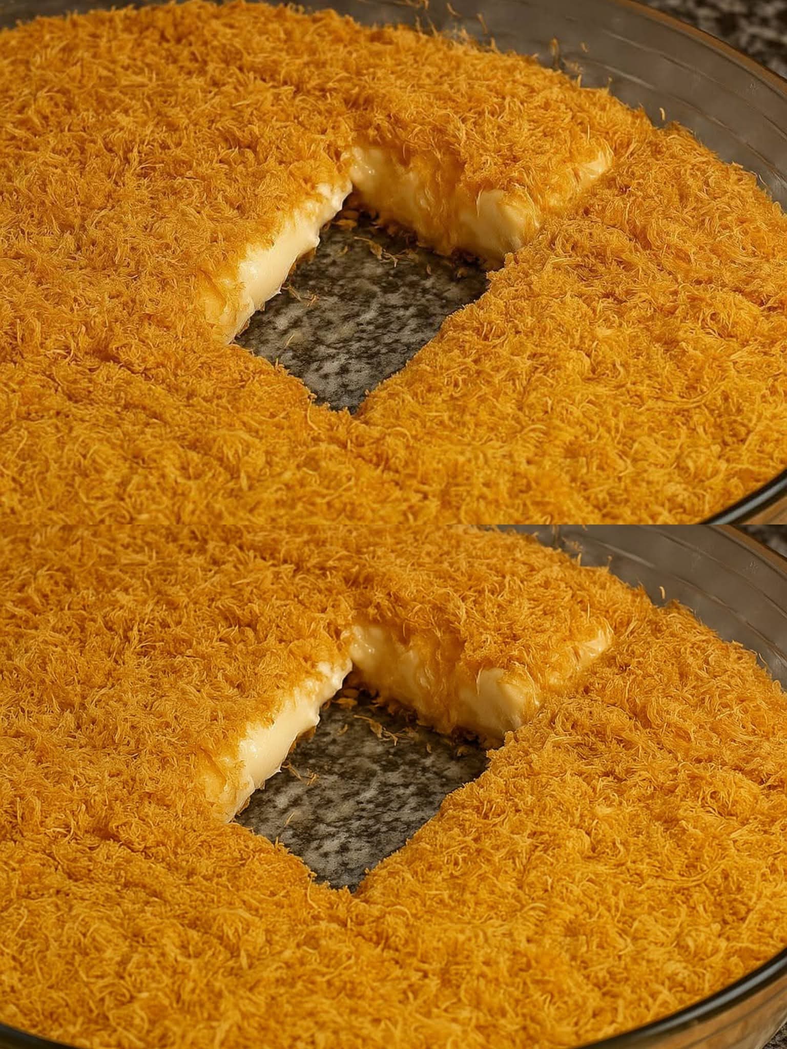 ننزل بطبقة القشطة اللي حضرناها، وبعدها باقي كمية الكنافة فوق.