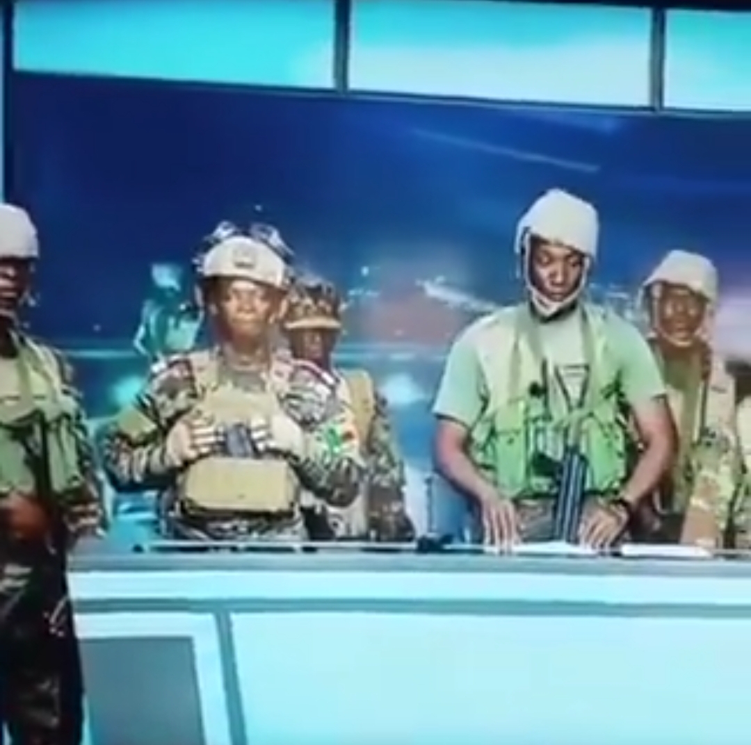 ظهر الجنود الذين أطلقوا على أنفسهم اسم اللجنة العسكرية لإعادة التأسيس على البث المباشر، معلنين “إقالة الرئيس تالون”، وحلّ الحكومة، وتعليق الدستور، وإغلاق الحدود البرية والجوية والبحرية. كما أعلنوا تعيين العقيد باسكال تيغري رئيسًا للّجنة التي وصفوها بأنها ستقود “مرحلة إعادة تأسيس الدولة”.