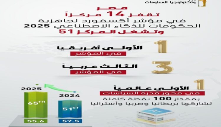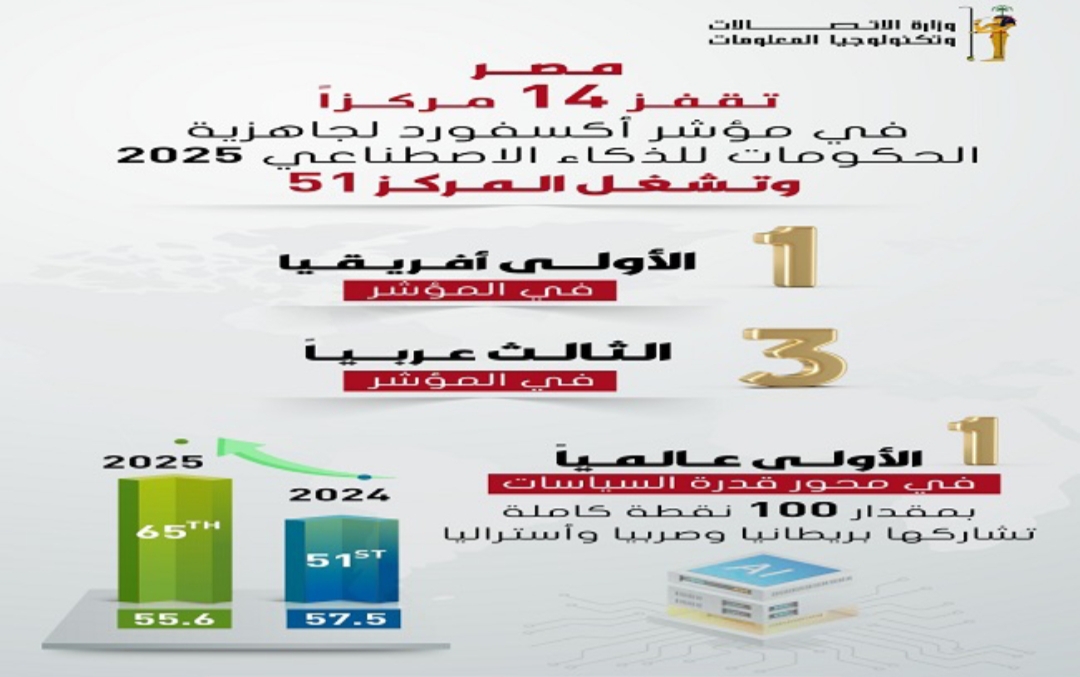 احتلت مصر المرتبة الأولى إفريقيًا في مؤشر جاهزية الحكومات للذكاء الاصطناعي لعام 2025 الصادر عن Oxford Insights، حيث تقدمت 14 مركزًا في المؤشر لتشغل المركز 51 عالميًا من بين 195 دولة، محققة 57.5 نقطة، مقارنة بالمركز 65 من بين 188 دولة محققة 55.6 نقطة في عام 2024. كما جاءت مصر في المرتبة الثالثة عربيًا، مقابل المركز السابع عربيًا في العام الماضي.