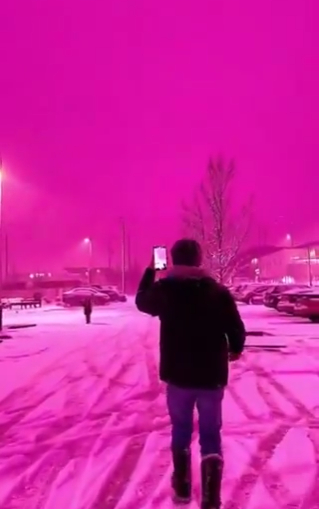 ويُظهر الفيديو المتداول السماء وهي تتلون بالوردي بشكل واضح، مع تساقط الثلوج في الشوارع والمنازل، وسط تعليقات مذهولة من المصورين، ما جعل المقطع واحدًا من أكثر المقاطع تداولًا خلال الساعات الأخيرة.