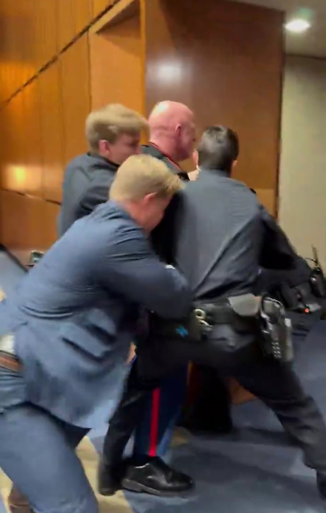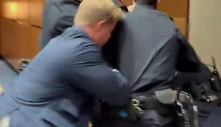 وأظهر الفيديو لحظة تدخل عناصر شرطة الكابيتول لإخراجه من القاعة بعد تعطيله لسير الجلسة، حيث تم رفعه بالقوة وسط حالة من التوتر داخل القاعة.