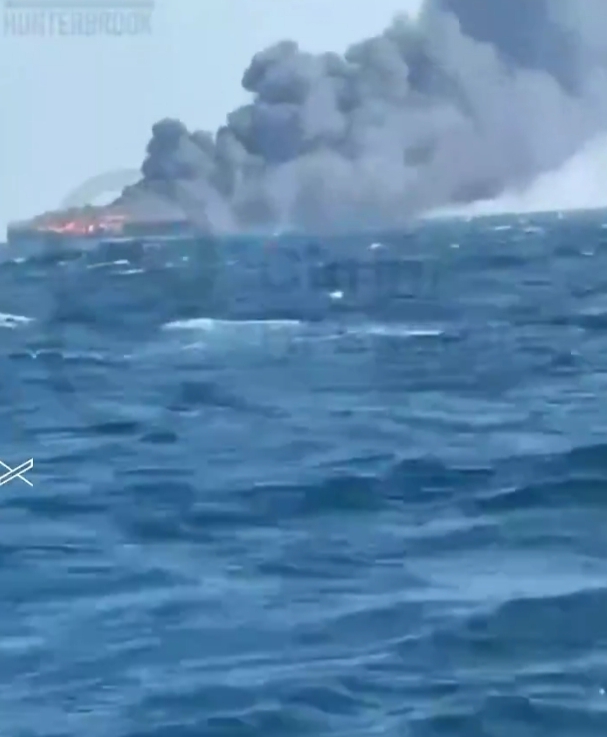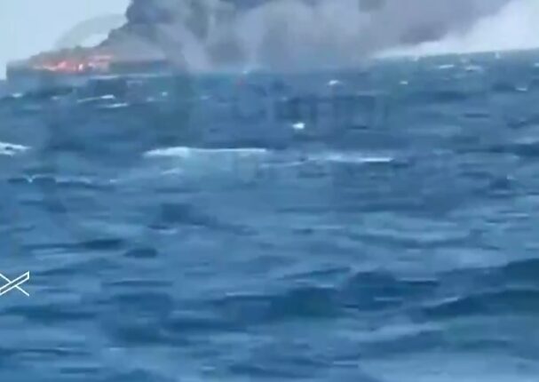 عاجل- سفينة تشتعل فيها النيران قرب #مضيق_هرمز.. فيديو
